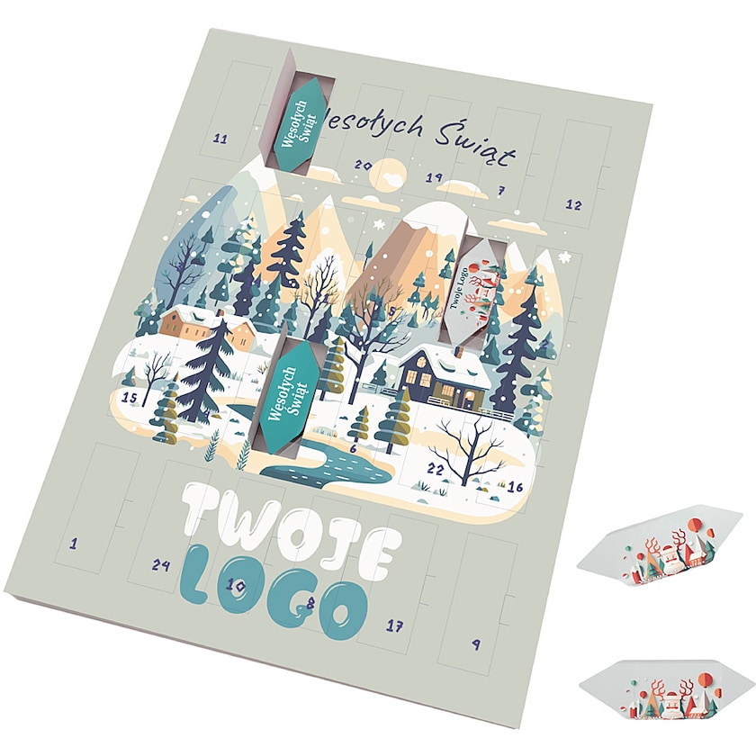 Adventskalender mit 24 köstlichen Fudge-Stücken. Wählen Sie zwischen den Geschmacksrichtungen Milch und Lebkuchen. Sowohl der Adventskalender selbst als auch das Papier, das den Fudge umhüllt, werden mit Ihrem Aufdruck versehen.