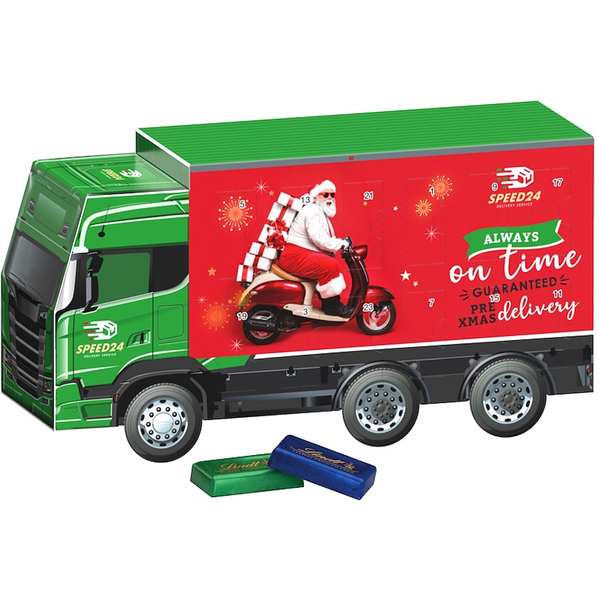 Lindt Adventskalender in LKW-Form. Einzigartiger Adventskalender, der sich von der Masse abhebt. Ideal für Transportunternehmen und Speditionen. Der Adventskalender ist mit Milchschokolade von Lindt gefüllt und in drei verschiedenen Folienfarben erhältlich.