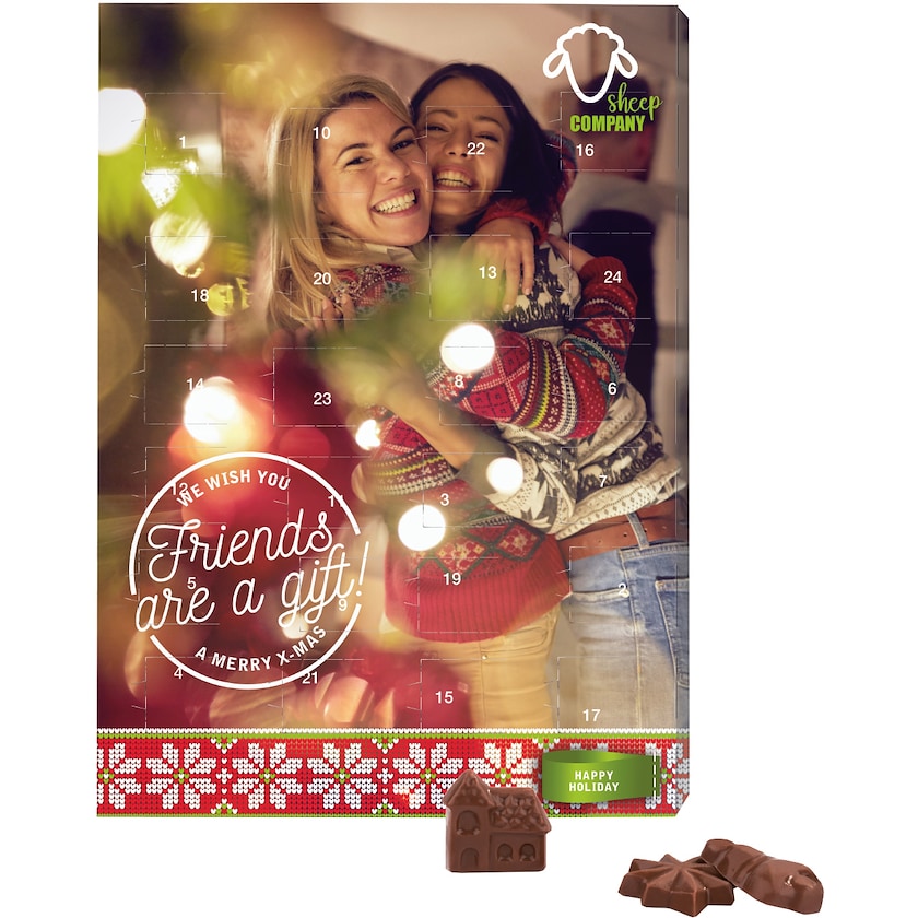 Umweltfreundlicher Adventskalender gefüllt mit köstlicher Milchschokolade. Der Pappkarton besteht aus FSC-zertifiziertem Papier und die Einlage ist kompostierbar. Die gesamte Produktion ist zu 100 % klimaneutral. Wählen Sie zwischen Hoch- oder Querformat. Verbreiten Sie Weihnachtsstimmung auf umweltfreundliche Weise!