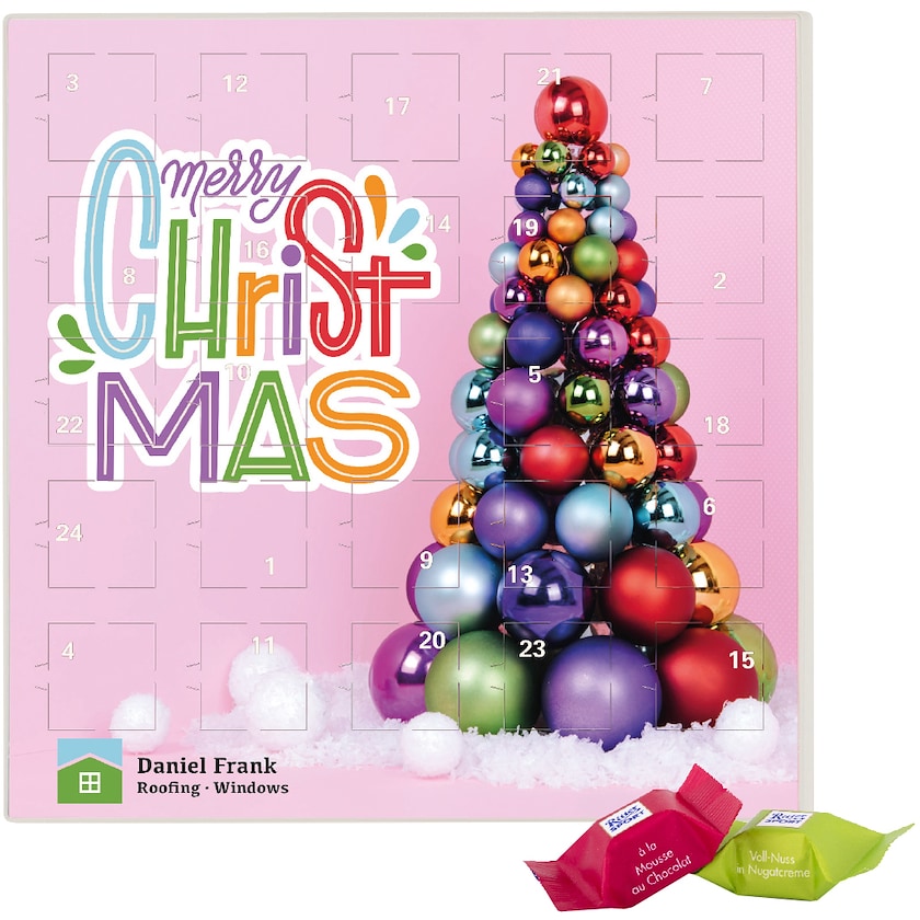 Quadratischer Adventskalender mit Schokolade von Ritter Sport. Der Adventskalender enthält 24 Schokoladenwürfel von Ritter Sport. Die EInlage ist kompostierbar und die gesamte Produktion zu 100 % klimaneutral.