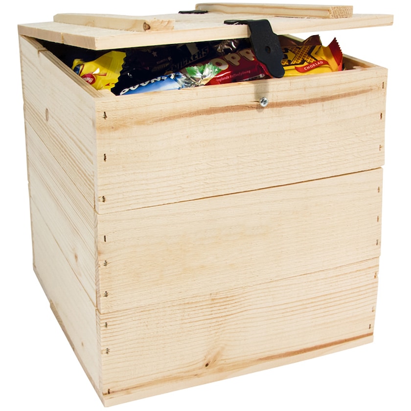 Holzkiste mit 2,5 kg hochwertiger Süßwaren. Enthält Bounty, Plopp, Milchschokolade und Kekse. Eine große Kiste voller Süßwaren. Der optionale 4-Farben-Druck ist auf einer unserer drei Grußkarten mit Weihnachtmotiv erhältlich. Die Karte liegt in der Box.
