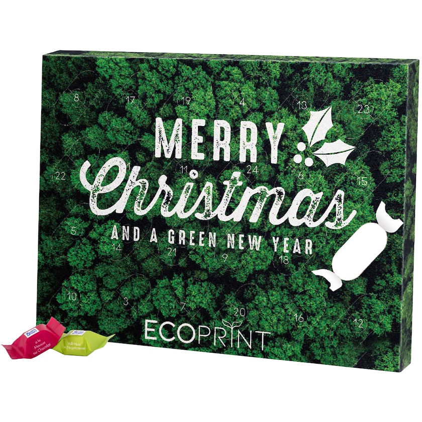 Umweltfreundlicher Adventskalender mit Schokolade von Ritter Sport. Der gesamte Adventskalender besteht aus Papier und ist somit ohne weiteres vollständig kompostierbar. Der Adventskalender ist gefüllt mit leckerer Schokolade der Sorte Ritter Sport Chocolate Cubes in gemischten Geschmacksrichtungen.