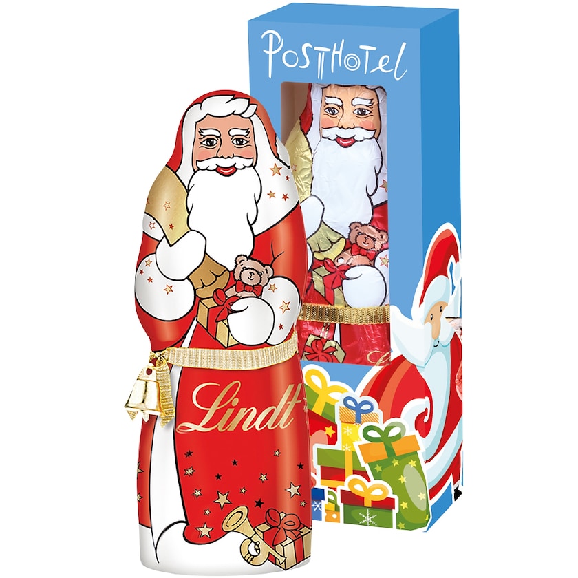 Bedruckbarer, großer Schokoladenweihnachtsmann aus Milchschokolade von Lindt. Die gesamte Verpackung lässt sich nach Ihren Wünschen bedrucken.