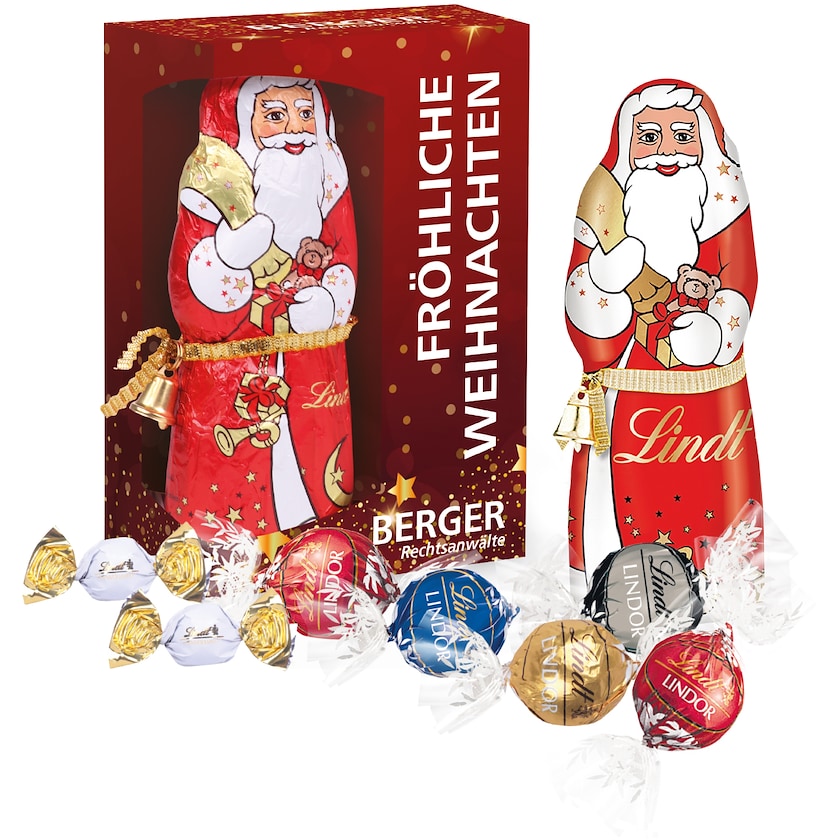 Bedruckbares Set von Lindt, bestehend aus einem Schokoladenweihnachtsmann und fünf Schokoladenkugeln. Die gesamte Verpackung lässt sich nach Ihren Wünschen bedrucken. Das verwendete Papier ist FSC-zertifiziert.