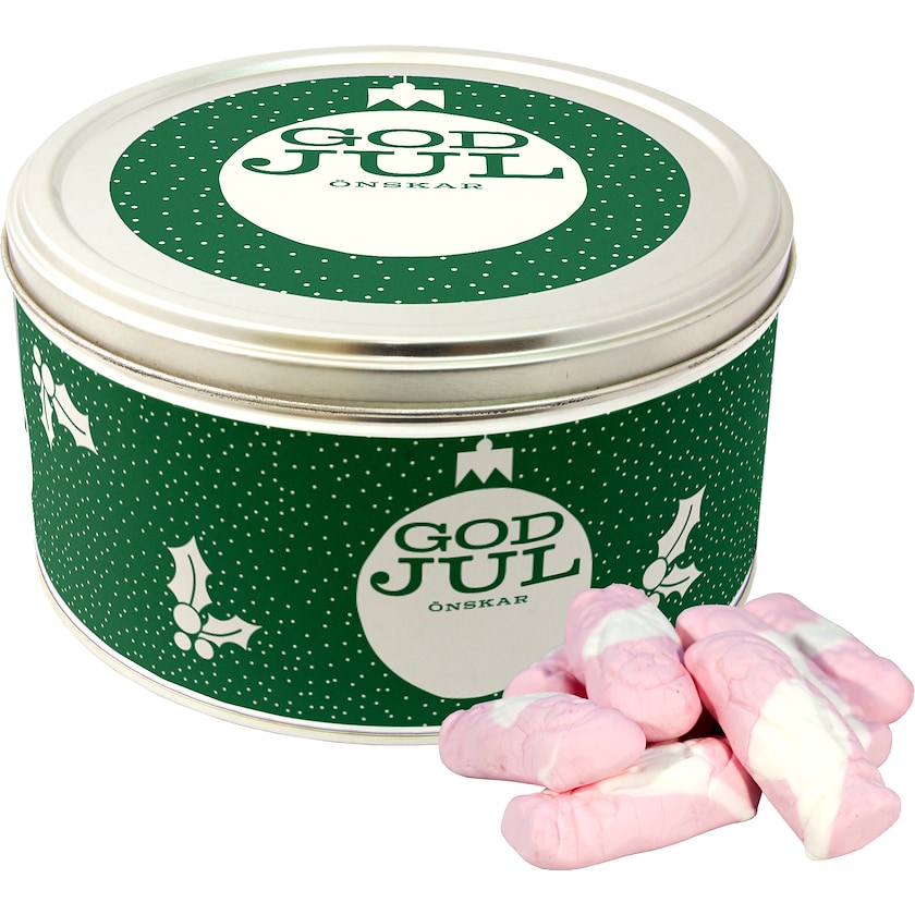 Blechdose, gefüllt mit Cloettas Schaumweihnachtsmännern. Mit selbstgestaltetem 4-Farbdruck Etikett an Deckel und Dose.