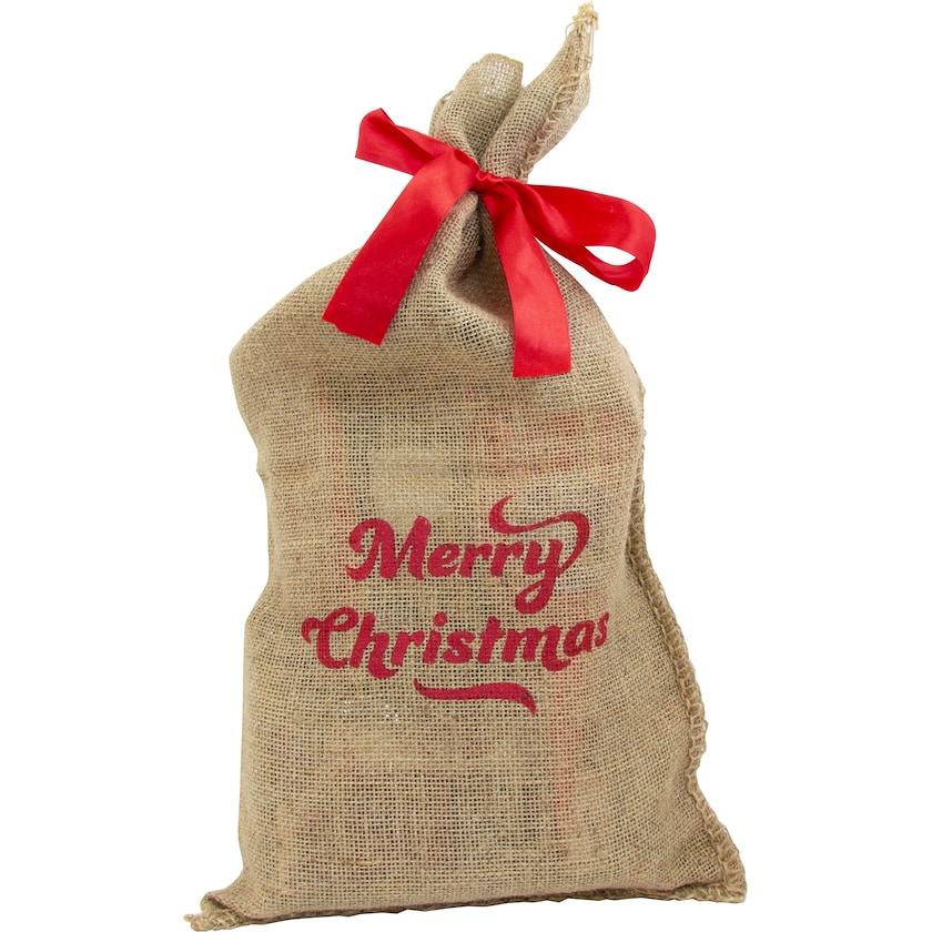 Großer Jutesack mit rotem „Merry Christmas“-Aufdruck. Der Jutebeutel enthält Milchschokoladenstückchen, Schaumzwerge, Marzipanpralinen, Karamellbecher, Cracker, Safranmandeln, Choco und zwei Sorten Schokoladentrüffel.