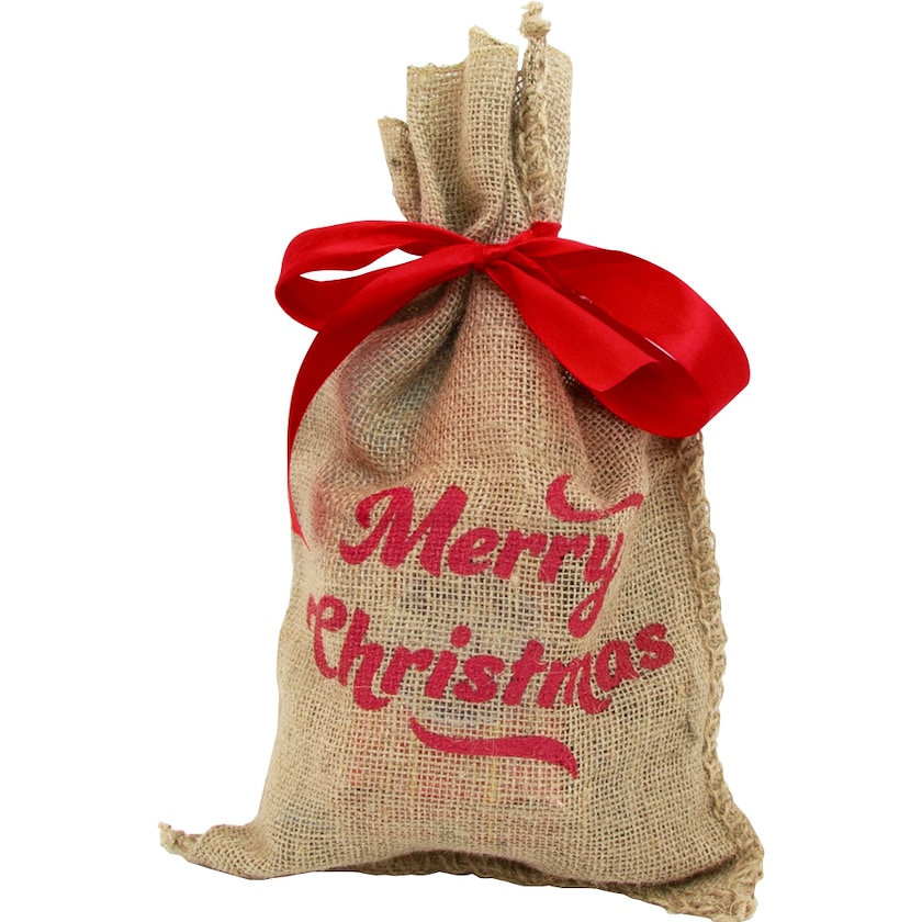 Kleiner Jutesack mit Aufdruck „Merry Christmas“ in Rot. Enthält Safranmandeln, Vollmilchschokoladenstückchen, Schokoladentrüffel, Marzipanpralinen und Marshmallows. Die Weihnachtstüte ist mit einer roten Schleife verschlossen. Kann mit Grußkarten ergänzt werden.