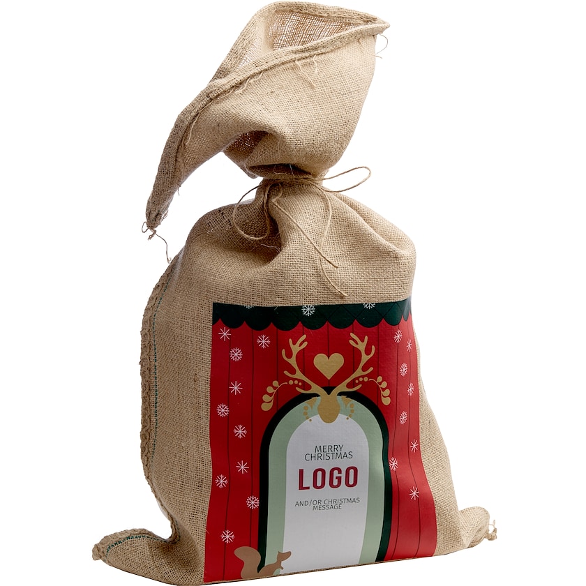 Großer Weihnachtssack aus Jute mit Weihnachtssüßigkeiten Ihrer Wahl. Der Weihnachtssack lässt sich mit Ihrem Druck versehen. Die Süßigkeiten sind in den Geschmacksrichtungen italienische Pralinenmischung, schokoladenüberzogene Karamellmischung, Weihnachts-Baiser und Weihnachtskaramellen-Mischung erhältlich.