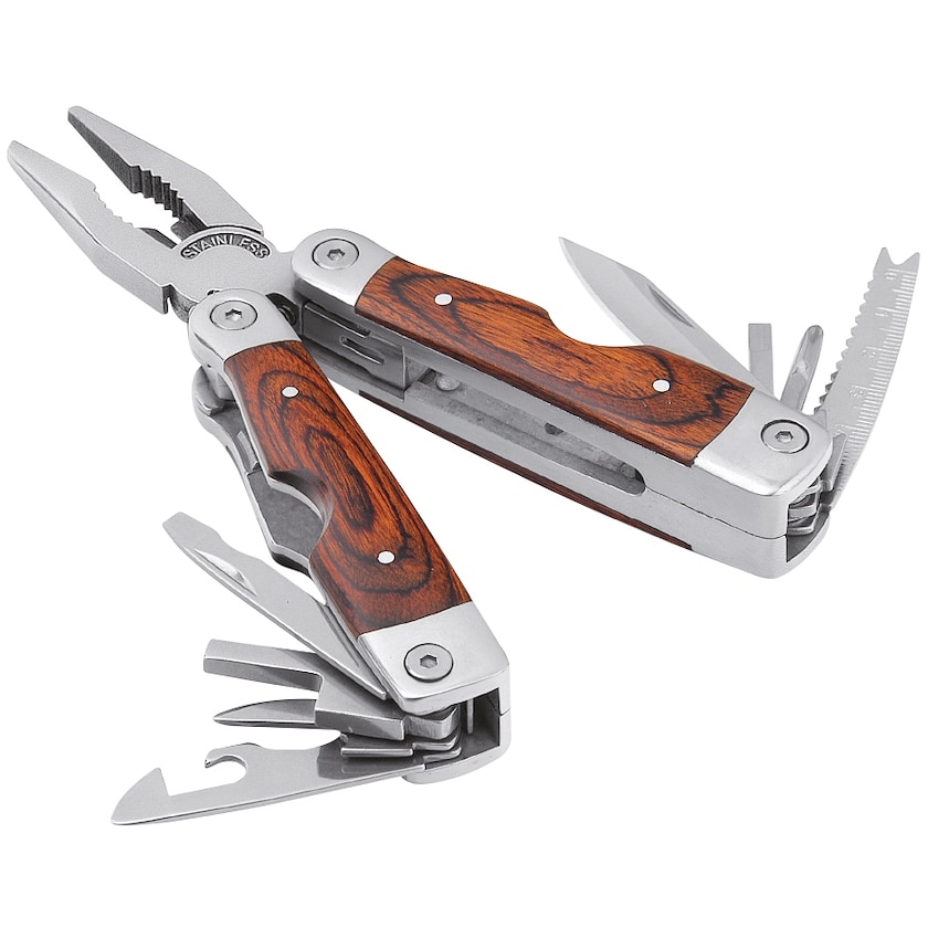 Praktisches Multiwerkzeug, Handgriff mit schönen Details Holz. Das Multitool Magnum verfügt über 22 Funktionen und wird mit Fodral geliefert.