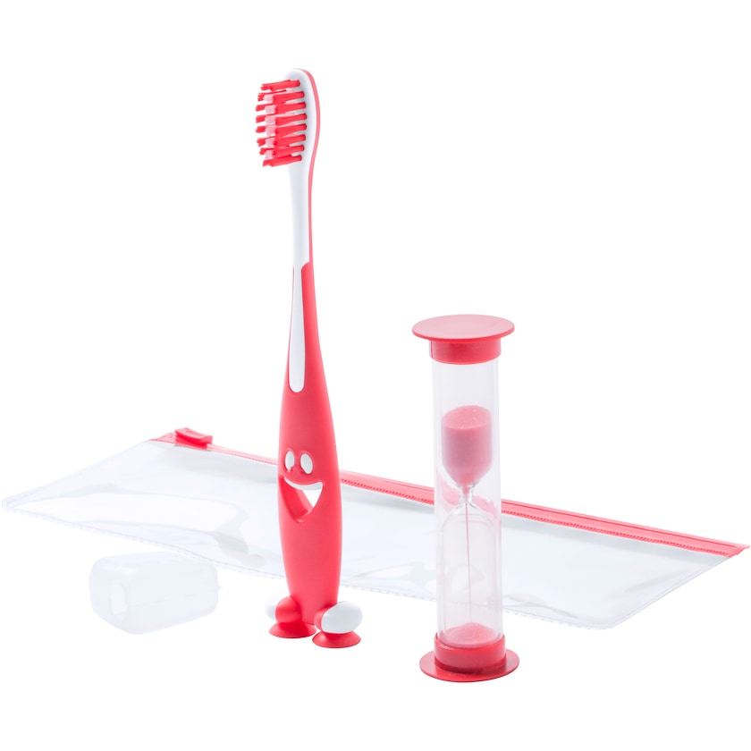 Set für Kinder mit Zahnbürste und Eieruhr. Wird in einem transparentem Kunststoffetui geliefert. Der Druck erfolgt auf dem Etui.