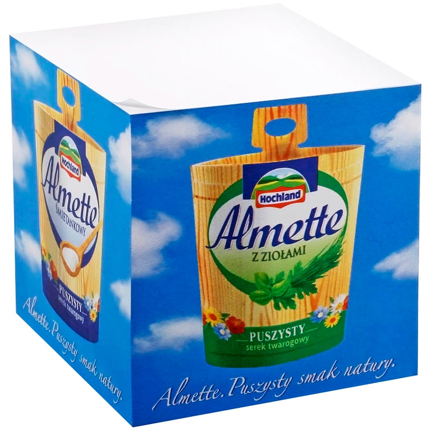 Großer Papierwürfel mit 900 Blatt. Der Druck beinhaltet 4-Farbfotodruck auf alle Seiten des Würfels, sowie jedes Blatt. Der Würfel ist an einer Seite geklebt, aber die einzelnen Seiten haben keine Klebefläche.