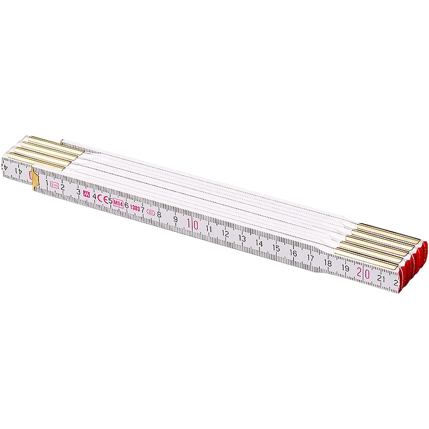 2 m-Holzzollstock für professionellem Gebrauch. Der Zollstock ist aus hochwertiger Buche, hat Messingbeschläge und verstärkte Stahlgelenke. Die Gelenke sind von Außen nicht sichtbar. Das Holz ist mit zwei Schichten bemalt und eine eine zusätzliche Schutzschicht. Der Zollstock wird in Europa hergestellt und bedruckt und erfüllt die EG-Baumusterprüfbescheinigung, Genauigkeitsklasse III EG und ist EC konform.